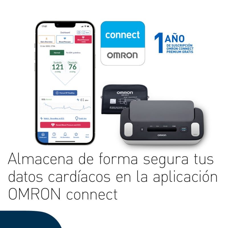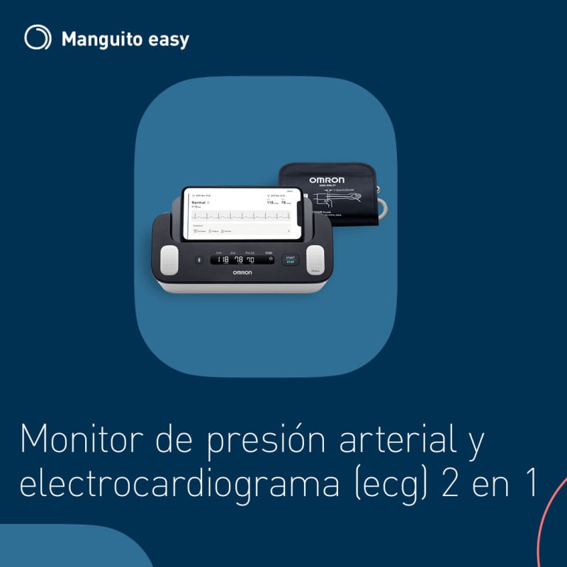 El OMRON Complete es un monitor inteligente 2 en 1, validado clínicamente, que mide la presión arterial y registra un electrocardiograma de una sola derivación simultáneamente. Detecta la fibrilación auricular (FA), la taquicardia, la bradicardia y la hipertensión, y ofrece resultados claros en la aplicación OMRON Connect. Con el Easy Cuff (22–42 cm), facilita la monitorización cardíaca en casa.